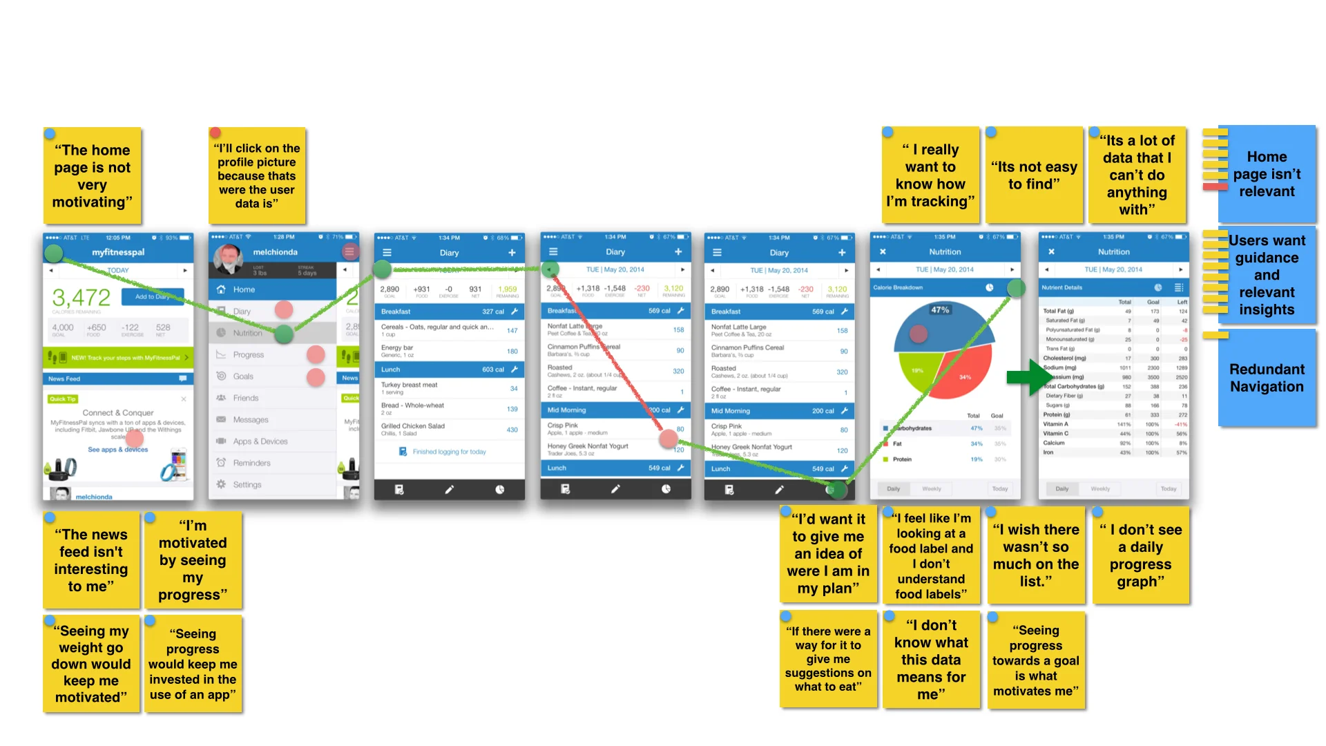 Click-path, quotes and insights gained from users logging a meal in the MyFitnessPal iPhone app.